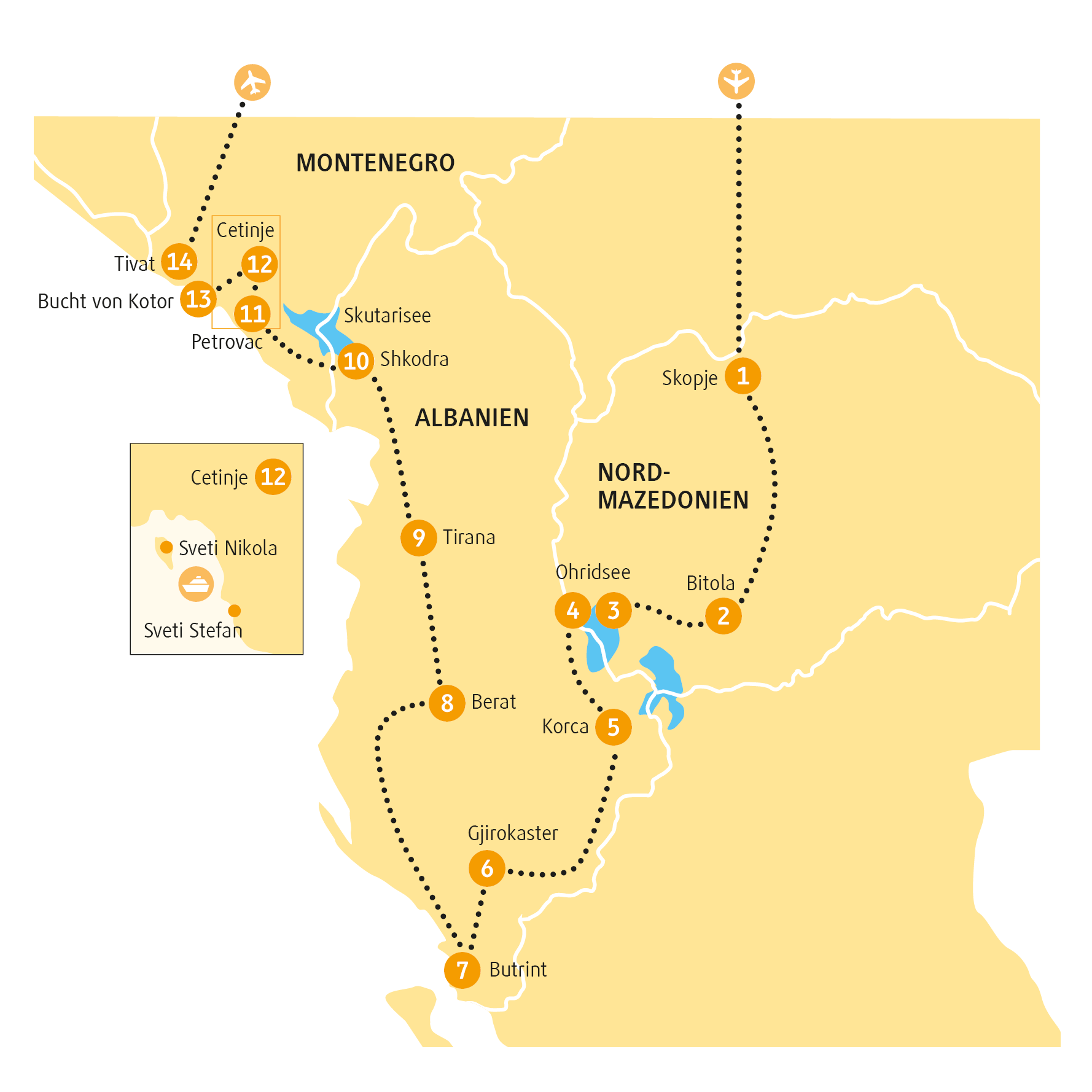 Die erste Etappe führt dich heute auf einer der spektakulärsten Straßen Montenegros nach Cetinje. Immer wieder erwarten dich tolle Ausblicke aus der Vogelperspektive auf kleine Buchten mit traumhaften Stränden. Alte Botschaftsgebäude und prachtvolle Renaissancepaläste erzählen später die Geschichte der alten Königshauptstadt. Einst Heimatstadt der Fürstenfamilie Petrovic ist Cetinje heute offizieller Sitz des montenegrinischen Präsidenten. Über kurvige Bergstraßen entlang des Lovcen-Nationalparks geht es weiter ins Dorf Njegusi, das für seine typisch lokalen Spezialitäten bekannt ist. Hier wird der berühmte Rohschinken produziert, den du mittags in einem urigen Gasthaus verkostest. Außerdem probierst du den traditionellen Traubenschnaps »Rijeka«. Zum Wohl – oder besser »Zivjeli«, wie es hier heißt! Eine atemberaubende Talfahrt hinab der Serpentinenstraße führt dich wieder an die Küste. Zunächst erkundest du Budva auf einem Spaziergang. Das historische Zentrum zählt zu den schönsten Altstädten des Landes. Anschließend unternimmst du eine Bootsfahrt mit tollem Blick auf die Küste und die Inseln Sveti Nikolaus und Sveti Stefan.