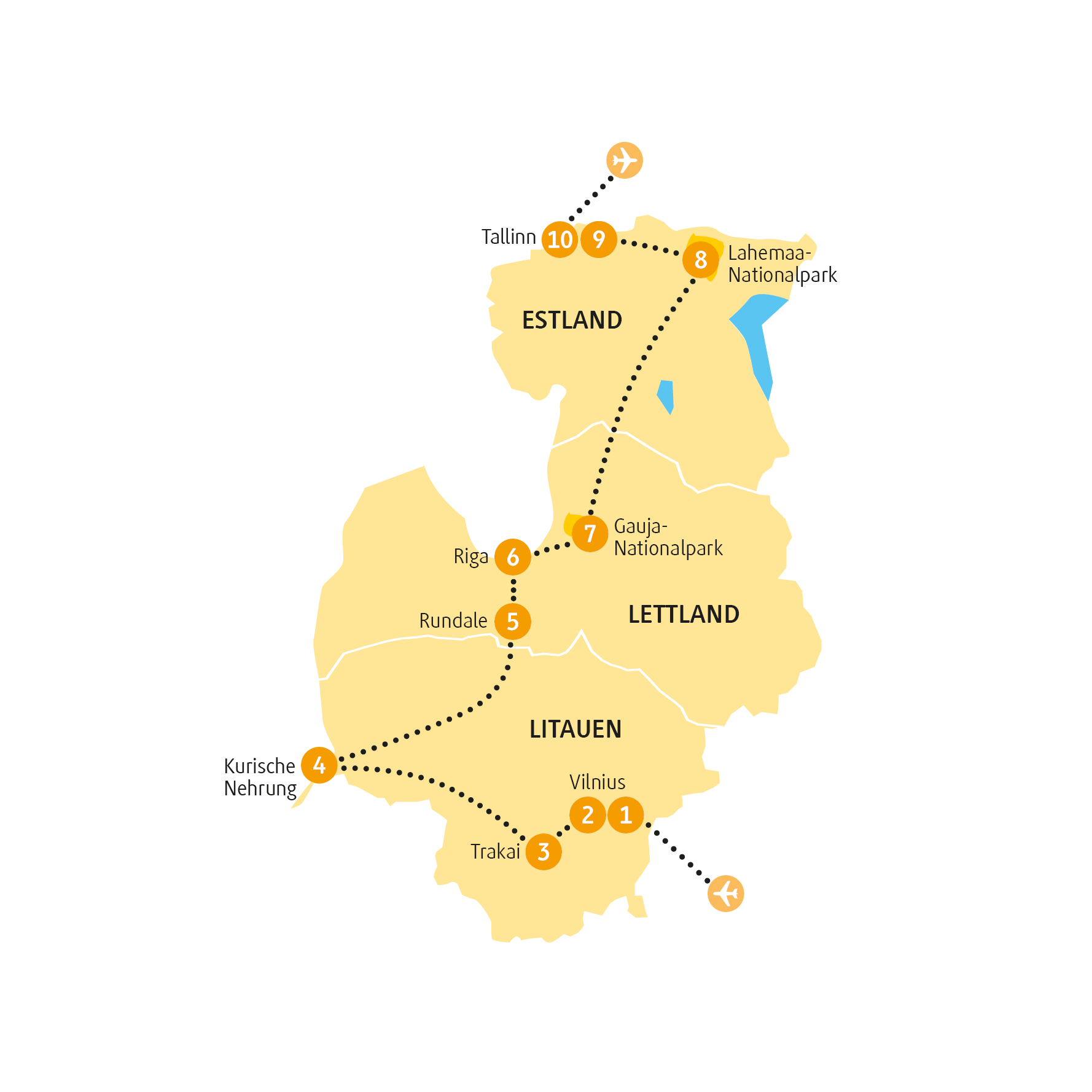 Mit einem Koffer voller Vorfreude fliegst du heute in die Hauptstadt von Litauen, wo deine Reise durch das Baltikum beginnt. Voller Spannung erwartet dich deine Reiseleitung am Flughafen Vilnius und bringt dich zu deiner Unterkunft. Schon beim ersten gemeinsamen Spaziergang wirst du beeindruckt sein von der Altstadt mit ihren mittelalterlichen Gassen und imponierenden Bauwerken wie dem Großfürstenpalast, dem frei stehenden Glockenturm und dem Burgberg mit Gediminas-Turm als Symbol der Stadt. Verpasse nicht den Sonnenuntergang auf dem Burgberg mit herrlichem Blick auf Vilnius, gekrönt von der Abenddämmerung.