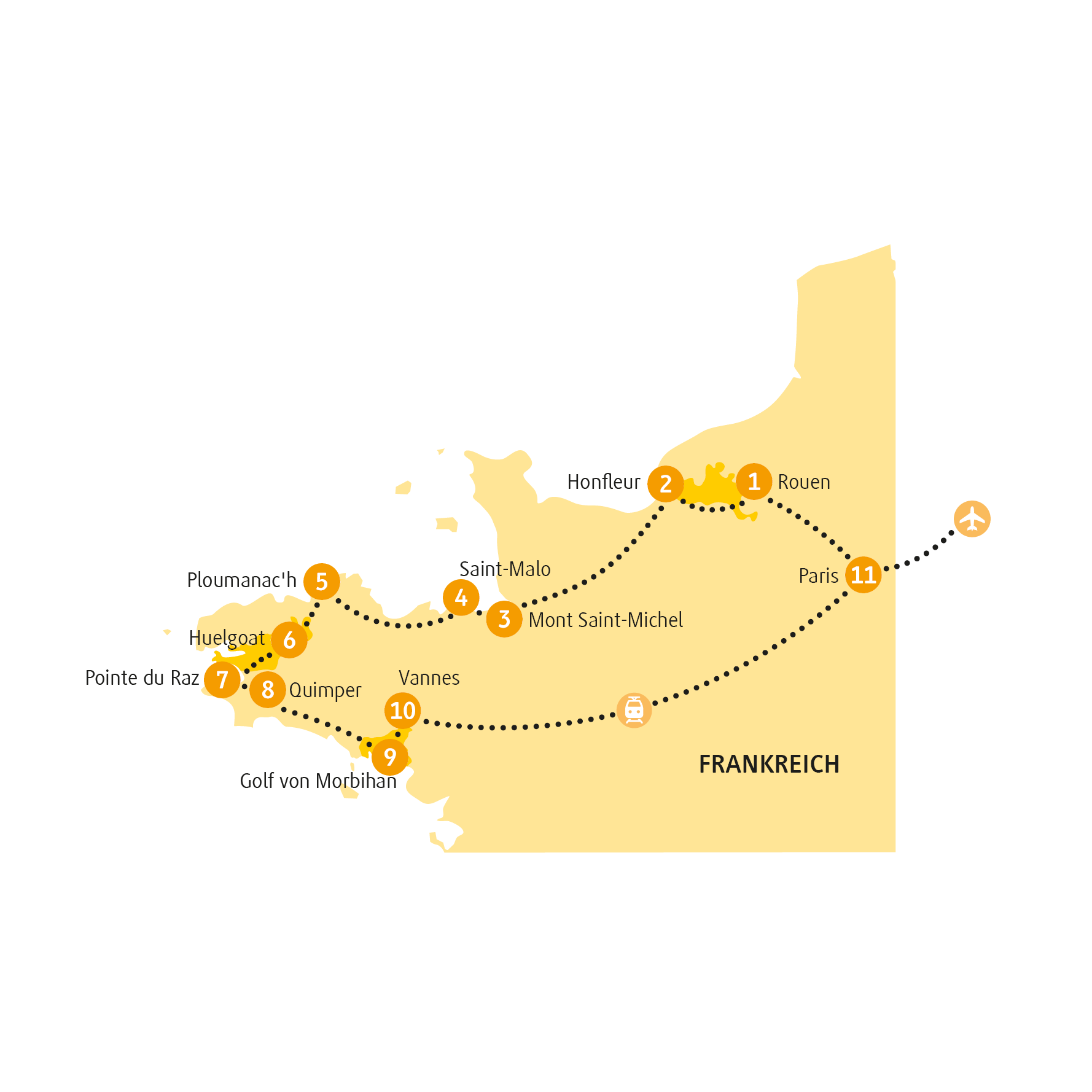 Du verlässt nun die Nordküste der Bretagne und fährst Richtung Süden. Unterwegs hältst du beim sagenumwobenen Wald von Huelgoat, um dir etwas die Beine zu vertreten. Bizarre Gesteinsformationen, ausladende Laubbäume und ein rauschender Wildbach. Kein Wunder, dass der Wald als Inspirationsquelle für Volksmärchen und Legenden dient. Der berühmteste Protagonist dieser Geschichten ist sicherlich König Arthur, der hier im Wald einst sein Feldlager aufgeschlagen haben soll. In Locronan kannst du eine Zeitreise ins 17. Jahrhundert machen. Der Ort ist beispielhaft für bretonische Architektur: massive Granitbauten und mit Schiefer gedeckte Dächer. Das inzwischen verwitternde Gestein und die bewachsenen Fassaden verleihen dem Ortsbild einen besonderen Charme. Die Halbinsel Crozon ragt wie ein gigantisches Kreuz in die Iroise-See hinein. Du unternimmst eine kleine Erkundungsfahrt mit dem Reisebus vorbei an spektakulären Klippen, türkisfarbenem Ozean, langen Stränden und Heidelandschaften. Zum Abschluss erklimmst du den Menez-Hom, den magischen Berg der Kelten. Mit seinen 330 Metern ist der erloschene ehemalige Vulkan einer der höchsten Punkte der Bretagne und bietet dir traumhaften Blick in die Ferne.