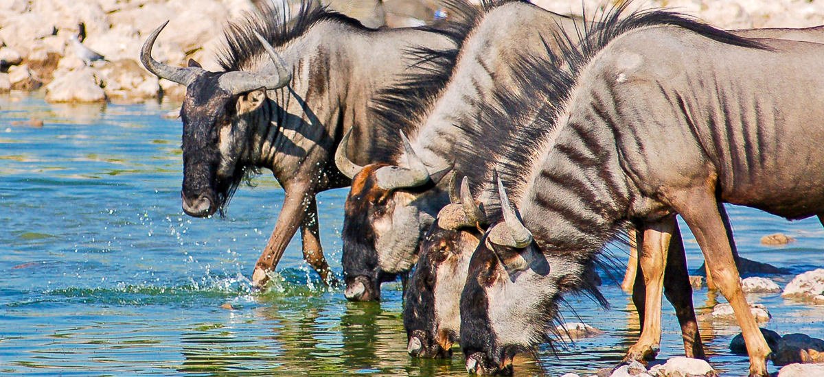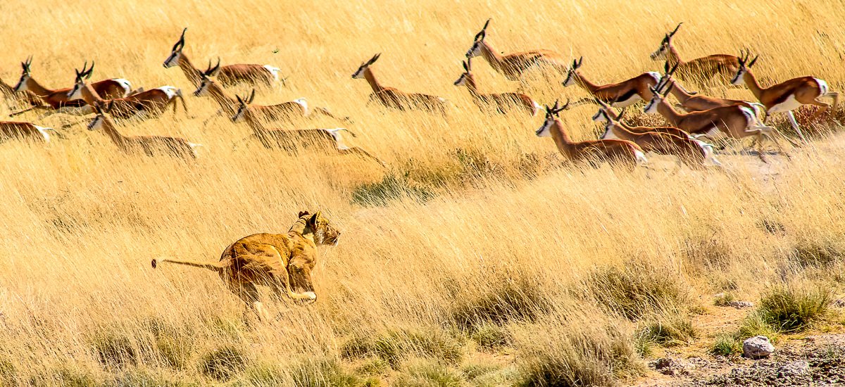 Wer will, darf ausschlafen, aber wer will das schon? Packe deine Kamera ein, es geht ans Wasser. Denn Wasser – und sei es nur ein Tümpel – bestimmt den Lebensrhythmus im Etosha-Nationalpark 5. Die offene Vegetation gibt den Blick frei auf Elefanten, Antilopen, Giraffen, Zebras und mit etwas Glück auch auf Löwen und Leoparden, die gern das Angenehme mit dem Nützlichen verbinden und ein paar Liter Wasser mit einem Streifengnu hinunterspülen. Oder umgekehrt, je nachdem. Wir führen dich zu den besten Motiven und geben dir aus sicherer Distanz das einzigartige Gefühl, ein Teil der Wildnis zu sein.
