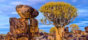 Auf dem Farmgelände des Mesosaurus Fossil Camp gibt es ca. 5.000 Köcherbäume. Der sympathische Farminhaber Giel Steenkamp erklärt mit viel Enthusiasmus bei einem Rundgang die Mesosaurus-Fossilien und zeigt dir auch den farmeigenen Köcherbaumwald, der eine imposante Sammlung der Aloenart Aloe dichotoma aufweist. Staune über die »singenden Steine«, eine Sammlung interessanter Doleritformationen. Auf der anschließenden Fahrt durch die berühmten roten Kalahari-Dünen geben wir dir natürlich Gelegenheit, auszusteigen und durch den roten Sand zu spazieren.
