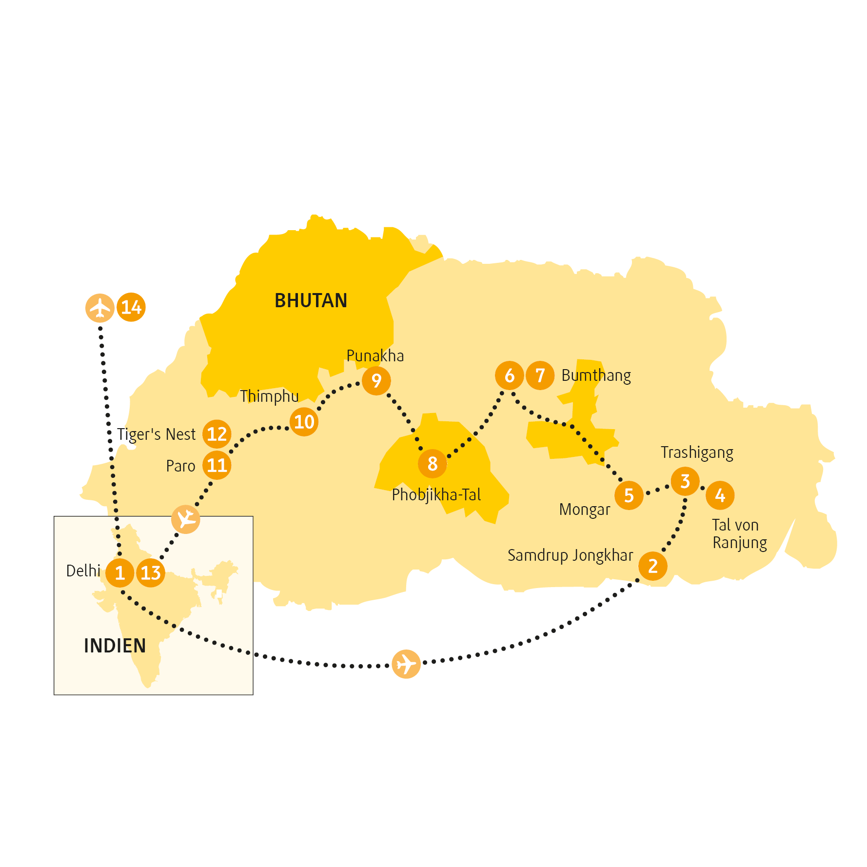 Eines Tages wird Bhutan direkt angeflogen werden und das wäre schön. Vielleicht auch nicht, damit die religiöse Seelentiefe noch lange ihre Ruhe hat. Wir nehmen den Weg wie am ersten Tag versprochen: mit überwältigenden Blicken auf die Landschaften und Himalaya-Gipfel zurück nach Delhi 13. Für das India Gate, den Palast des Präsidenten und das Weltkulturerbe Qutub Minar ist noch Zeit, bis dein Flieger geht. Natürlich geht er nicht, sondern fliegt dich komfortabel nach Frankfurt 14. Wie lange es auch halten mag, für den Moment jedenfalls bist du ein anderer Mensch geworden.