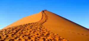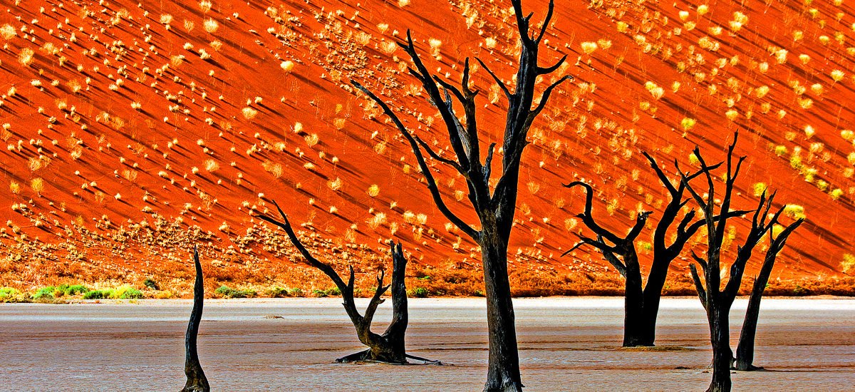 Wir wissen, du wartest darauf: Sossusvlei 13, schon immer ein Wunder und nun auch UNESCO-Weltnaturerbe. Kaum dass die Sonne aufgegangen ist, sind wir bereits da. Die einzigartige Lichtstimmung am frühen Morgen wirkt wie ein Zugpferd und begleitet uns durch eine außerirdische Dünenlandschaft entlang 500 Jahre alter abgestorbener Akazien im Dead Vlei zum Dünenkamm und weiter, bis du oben bist. Ein 350 Meter hoher Sandhaufen, das ist der Gipfel. Für einen Gipfel der Genüsse wird noch einmal deine Desert Hills Lodge sorgen. Die Küchencrew hat’s versprochen, und wir sind sicher, für das rosarot geröstete Freilandsteak zum regionalen Bio-Gemüse ist das Springböckchen schon im Visier.