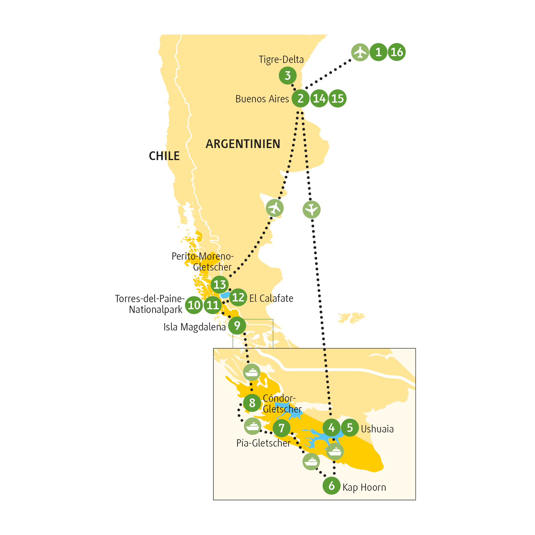 Hinweise:Das Programm an den Tagen 4 und 5 kann in anderer Reihenfolge stattfinden. Den Flugplan für den Inlandsflug von Buenos Aires nach Ushuaia erhälst du mit den Schlussunterlagen.