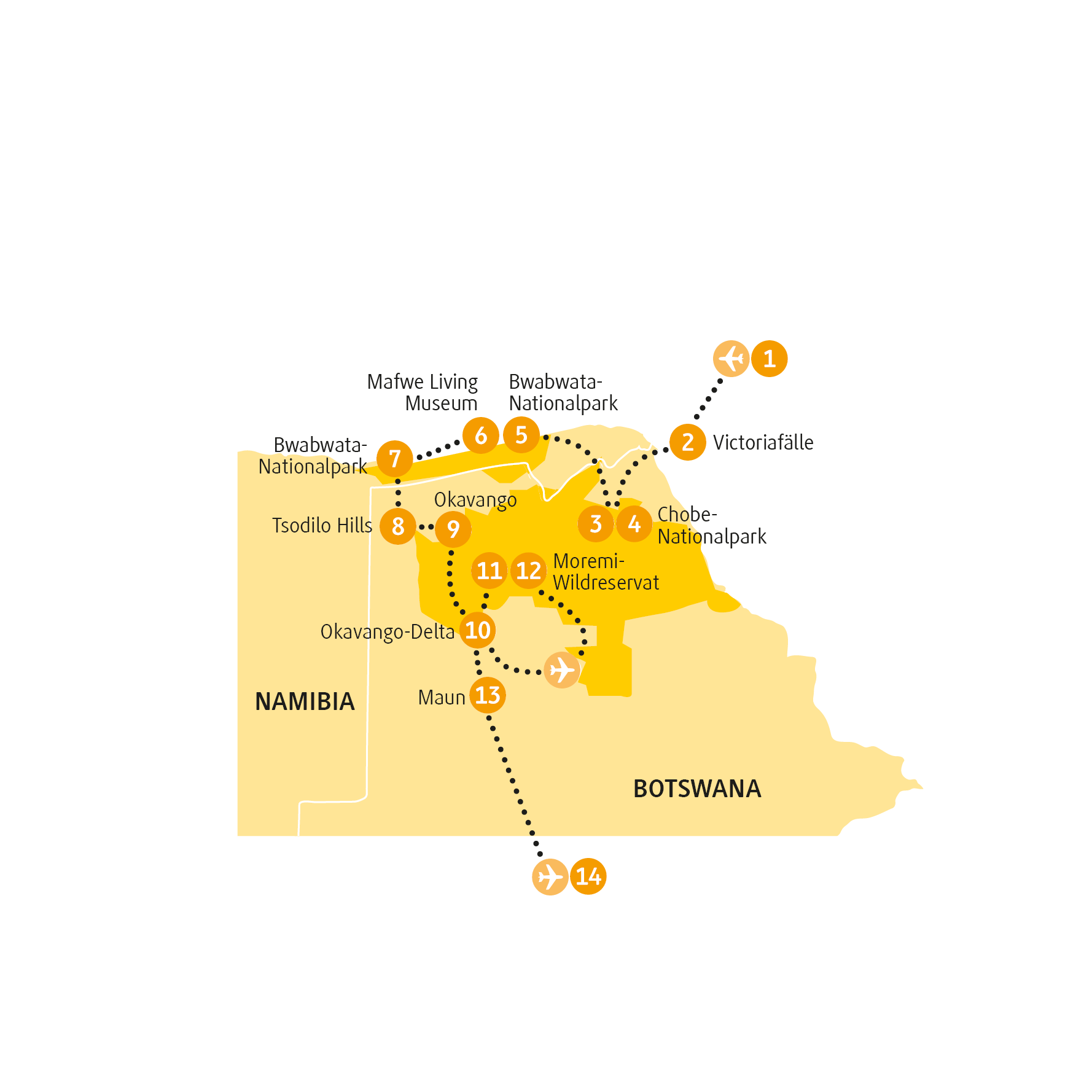 Kilometer:Die Fahrstrecke von Maun umfasst ca. 60 km. Die Fahrzeit beträgt ca. 1 ½ Stunde zuzüglich ca. 4 bis 5 Stunden Tierbeobachtungen im offenen Geländewagen.