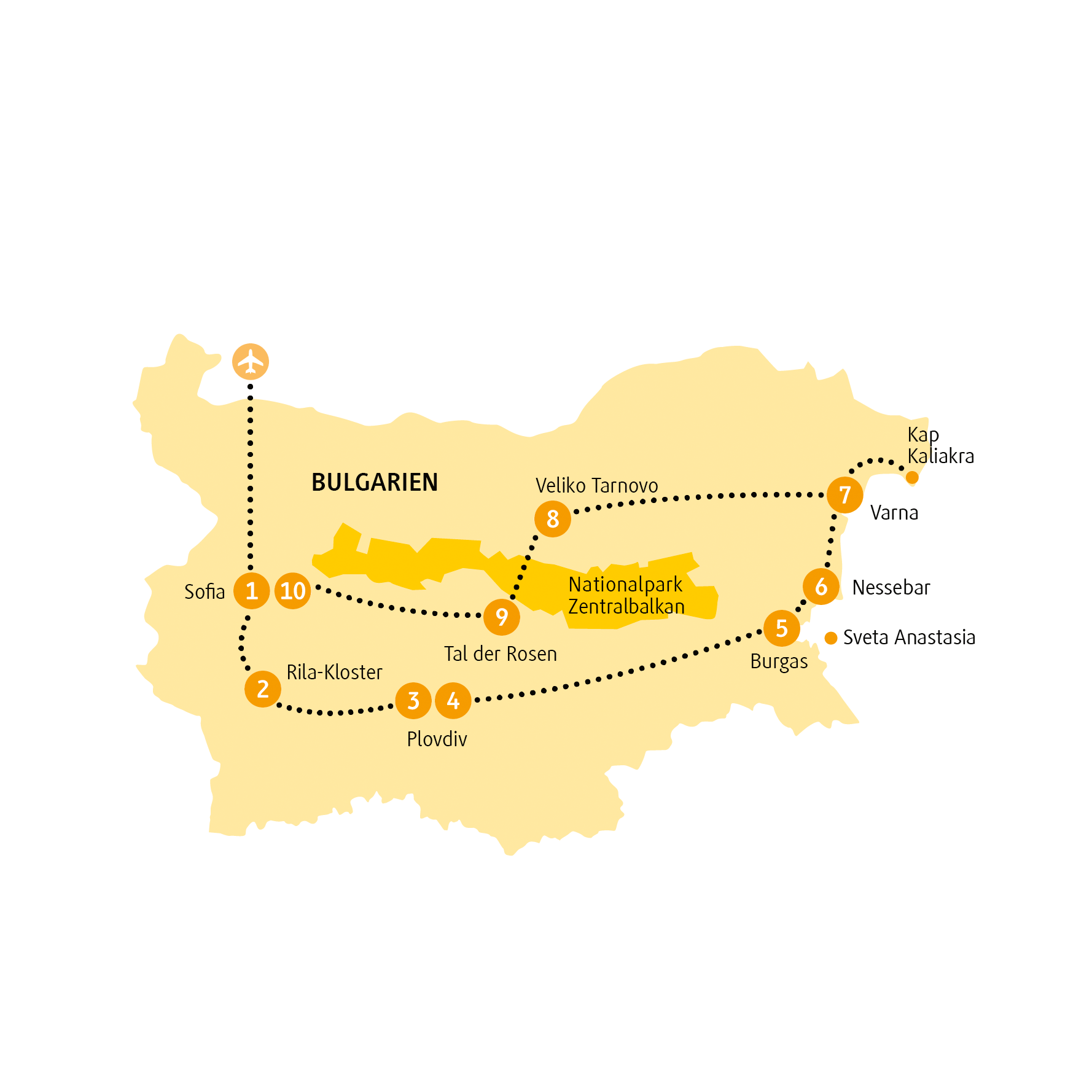 Auf der Fahrt zum Flughafen wirst du noch ein ganzes Stück von der Bergkette des mächtigen Balkangebirges begleitet. Gegen Mittag erreichst du den Flughafen Sofia und fliegst zurück nach Hause. Im Gepäck: unvergessliche Erinnerungen an ein überraschend vielseitiges Land mit herzlichen Gastgebern.