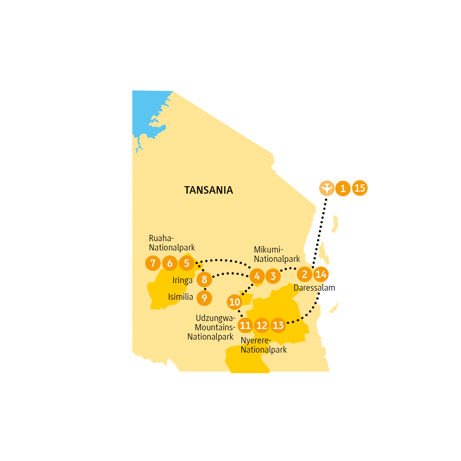 - 6 Safaris im Geländewagen: 2 im Nyerere-NP, 2 im Ruaha-NP, 2 im Mikumi-NP; 1 Safari zu Fuß und 1 Bootsafari im Nyerere-NP; Wanderung im Udzungwa-Mountains-NP