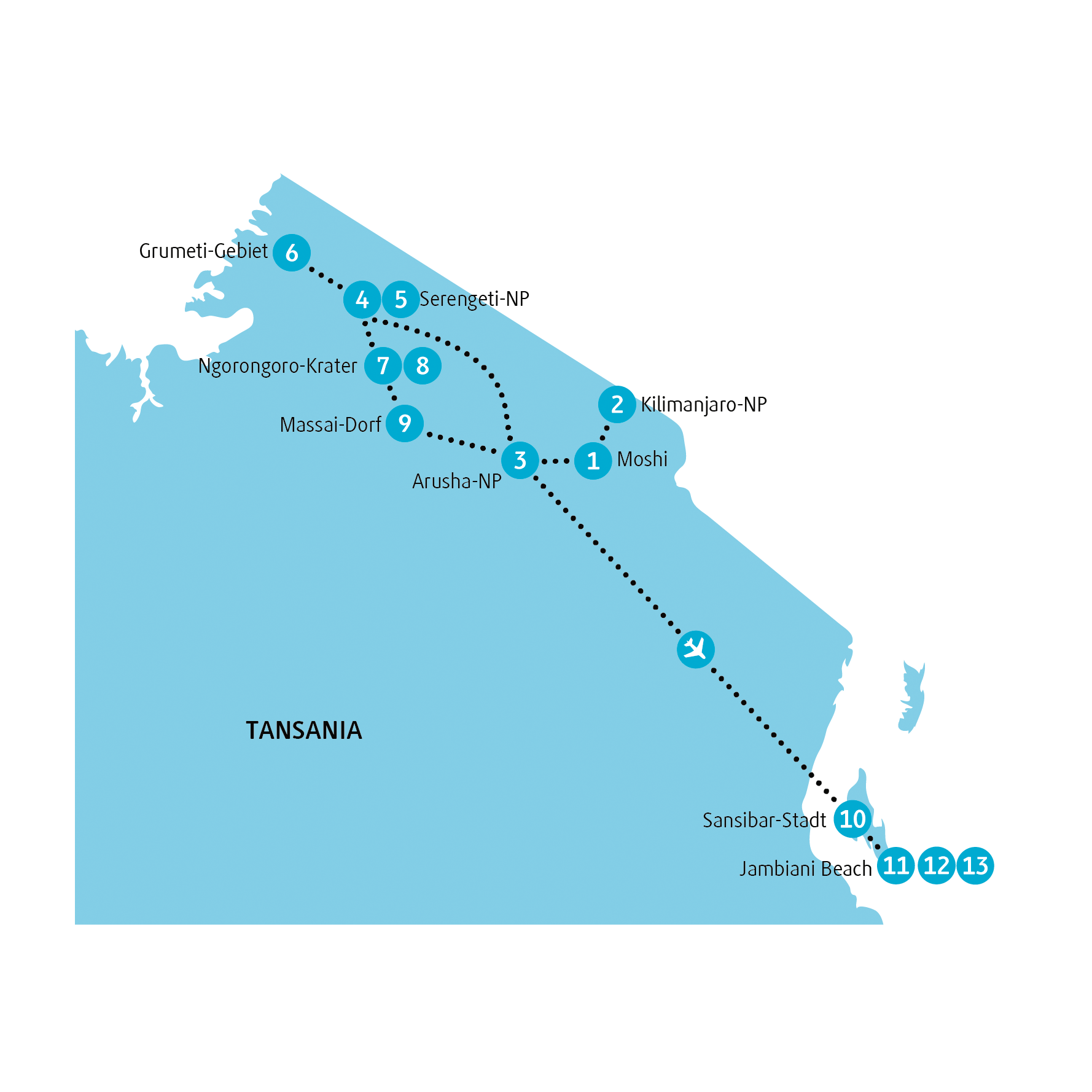- 12 Übernachtungen in Hotels und Zeltcamps während der Safari sowie einem Strandresort auf Sansibar