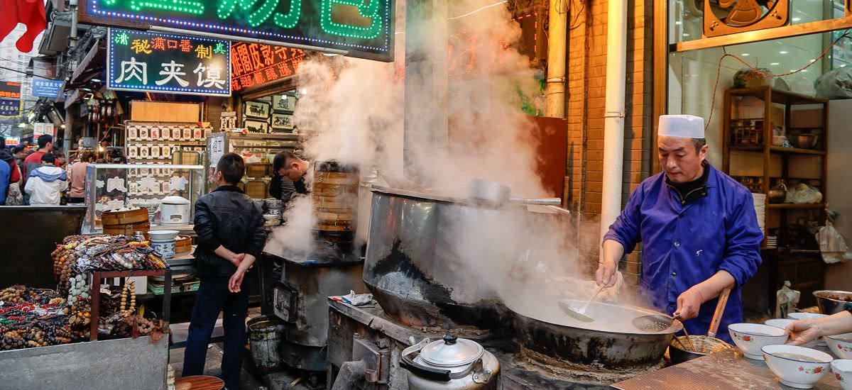 Um halb acht des neuen Tages empfängt dich die alte Kaiserstadt Xi’an 5 mit einem Frühstück im Hotel unweit der alten Stadtmauern. Da sind ein paar Fahrräder für uns reserviert, die auf sehr ungewöhnliche Art bewegt werden wollen: immer der Mauer nach, zwölf Kilometer lang. Und zwar obendrauf. Du hast richtig gelesen: auf der gewaltigen Stadtmauer einmal um den alten Kern von Xi’an, mit Glocken- und Trommelturm aus Kaisers Zeiten. Diese Runde hat alle hungrig gemacht, da kommt die jeder Chaostheorie entsprechende Altstadt mit ihren unzähligen Märkten, Verkaufsständen und Garküchen gerade recht. Hui ist hier kein Ausdruck kulinarischer Raffinesse, sondern der Name der nur in Xi’an ansässigen Hui-Minderheit. Stelle weder hier noch auf dem Nachtmarkt die Frage nach dem Ladenschluss. Gibt es nämlich nicht.