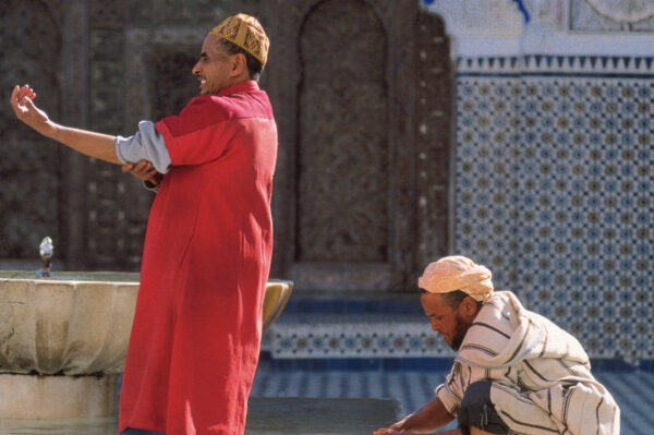 Wir schauen uns in der ältesten und schönsten Medina Nordafrikas um und fühlen uns in den Orient des Mittelalters zurückversetzt. Beim Spaziergang durch die verwinkelte Altstadt hören, riechen und sehen wir die Viertel der Gerber, Kupferschmiede, Färber, Tischler und Gewürzhändler. Wir passieren die wunderschöne Kairaouine-Moschee, eine Kombination aus Moschee und islamischer Hochschule, und das Grabmal des Moulay Idriss II.. Als Nichtmuslime kann man beide Monumente nur von außen betrachten ─ und wir nehmen die Attarine-Medersa in Augenschein, eine wunderbar prächtige Koranschule, deren Studenten jedoch asketisch einfach wohnten. Wir tauchen ein in die maghrebinische Teekultur und hören das Sprudeln des heißen Wassers, das Geräusch der ausgießenden Teekanne. Die marokkanische Minze wird auch Nana-Minze genannt. (F, A)