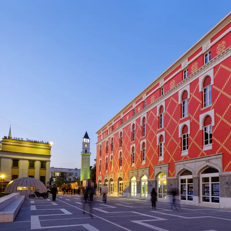 Zu Fuß durch Tirana. Vom aufgestylten Grünmarkt über den Skanderbeg-Platz zur Et'hem-Bey-Moschee und vorbei an kommunistischen Prachtbauten. Die Skyline aus Bürotürmen glitzert, die Häuserfassaden strahlen in bunten Farben. Die Stimmung jung, frisch, sympathisch! Die Hauptstädter scheinen offen für alles: Fast Food vom Straßengrill und Slow Food im Edelrestaurant. Rap auf Albanisch und der Ruf des Muezzins, fliegende Händler und Luxusboutiquen. Nachmittags und abends machen Sie Ihr Ding. Im Stadtpark Kaffee trinken? Szeneviertel? Markthallen? (F)