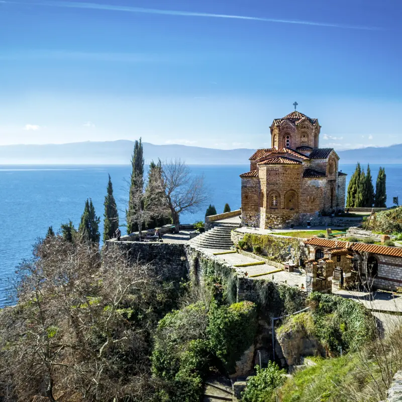 Auf nach Nordmazedonien an den Ohrid-See – ein Traum in Türkis! Sightseeing mit dem lokalen Scout in Ohrid: treppauf, treppab und hoch zur Kaneokirche, der Fotoikone schlechthin. Dazwischen Gärten voller Kiwis und Trauben, freskenreiche Gotteshäuser, Mosaikkunst an Ausgrabungsstätten. Aussichtsreich per Boot zurück zu unserem Hotel, ideal zwischen Altstadt und Seeufer gelegen. Gleich zum Baden in den See? Oder am freien Nachmittag lieber die Festung erobern? Abends vielleicht gegrillter Fisch auf einer Restaurantterrasse am See? (F)