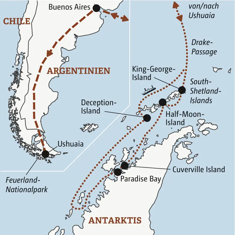 Kommen Sie mit auf Expeditionskreuzfahrt in die grandiosen Landschaften aus Eis und Schnee der Antarktis. Lassen Sie sich vom weißen Kontinent und seiner faszinierenden Tierwelt – allen voran Pinguine und Robben – in seinen Bann ziehen. Über die berühmte Drake-Passage erreichen wir die antarktische Halbinsel und nähern uns der Fauna auf zahlreichen Zodiak-Touren. Zur Einstimmung lockt zu Beginn die Tango-Metropole Buenos Aires – und Ushuaia mit dem Feuerland-Nationalpark rundet diese besondere Reise ab.