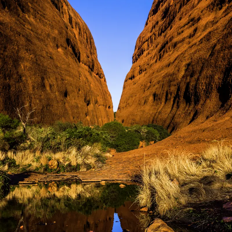 Flug zum Ayers Rock. Am Nachmittag Fahrt zu den Olgas. Zwischen kuppelartigen, bis zu 548 m hohen Felsen steigen Sie hinab in die Walpa Gorge, wo Sie eine Wanderung unternehmen. Abenteuerlich: In der Wüste sitzen und fasziniert zusehen, wie die untergehende Sonne den heiligen Berg der Aborigines in ein tiefes Orangerot taucht (englischsprachig, gemeinsam mit anderen Reisenden).