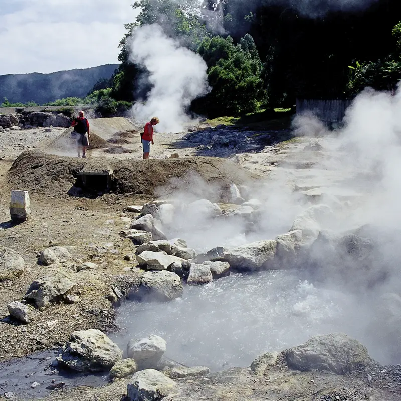 Ab an die Nordküste: Hier wächst auf Terrassen hoch oberhalb des Meeres tatsächlich Tee. Wir stoppen bei der Fabrik zu einer Teeverkostung und genießen ein tolles Panorama: Saftiges Teebaumgrün trifft auf tiefblaues Meer. Anschließend fahren wir hinauf zur Lagoa das Furnas. Am Pico do Ferro legen wir einen kleinen Stopp ein und haben bei schönem Wetter wundervolle Aussicht auf den See. Hier blubbert es aus Schlammpfuhlen – die Vulkaninseln lassen ihr Temperament erahnen. Wir machen einen Spaziergang am Ufer des romantischen Furnas-Sees. Wer mag, kann zum Mittagessen den typischen Cozido, einen Eintopf aus Fleisch und Gemüse, probieren; er gart in der heißen Erde am See. Ein Highlight für Gartenfreunde: der Terra Nostra Park. Hier kann man mitten im Park in den heißen Quellen baden! (F)