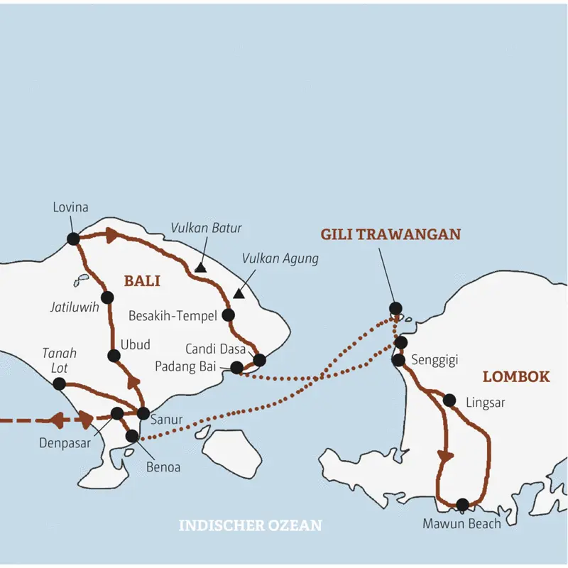 Willkommen zum Inselhüpfen im Indischen Ozean! In der Mini-Gruppe erleben wir die Götterinsel Bali ganz nah: Wir wohnen in kleinen, geschmackvollen Hotels, packen im Dorf bei der Reisernte mit an, schwingen in Ubud selbst den Kochlöffel, radeln mit Blick auf Reisterrassen und Vulkangipfel, sammeln Eindrücke von Stränden und Sonnenuntergängen. Sehr ursprünglich: die Nachbarinsel Lombok. Zum Abschluss relaxtes Strandfinale auf der kleinen Insel Gili Trawangan.