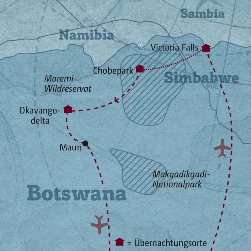 Die Idee dieser Reise: von den Viktoriafällen in Simbabwe auf dem Landweg nach Botswana. Der Routenvorschlag unserer Länderexpertin lässt Ihnen viel Zeit für Tierbeobachtungen, u. a. im Okavangodelta und im Chobe-Nationalpark. Den "donnernden Rauch" – wie die Toka Leya die VIKTORIAFÄLLE nennen – sehen und hören Sie schon von Weitem. Die Wasserfälle sind die größten der Welt und besonders während der Regenzeit bombastisch. Toller Urlaubseinstieg: die Sundowner-Cruise.Auf dem Trans-Kalahari Highway weiter nach Botswana. Am Straßenrand immer wieder Elefanten. Und Giraffen, die ihre Hälse in die Kronen der Akazien recken. Ein Highlight ist die Fahrt im Mokoro durch die papyrusgesäumten Sümpfe des OKAVANGODELTAS. Ein Teppich aus Lilien bedeckt das Wasser, dazwischen lugen die Augen von badenden Flusspferden hervor. Bloß nicht schaukeln und umkippen!