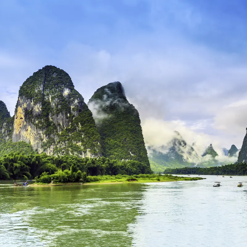 Von Bord eines Floßes aus verschaffen wir uns am Vormittag einen entspannten Überblick: sanftes Dahingleiten auf dem Li-Fluss, an den Ufern reiht sich ein Zuckerhut an den anderen. Am freien Nachmittag Räder mieten und durchs Bilderbuch-China radeln? (F)