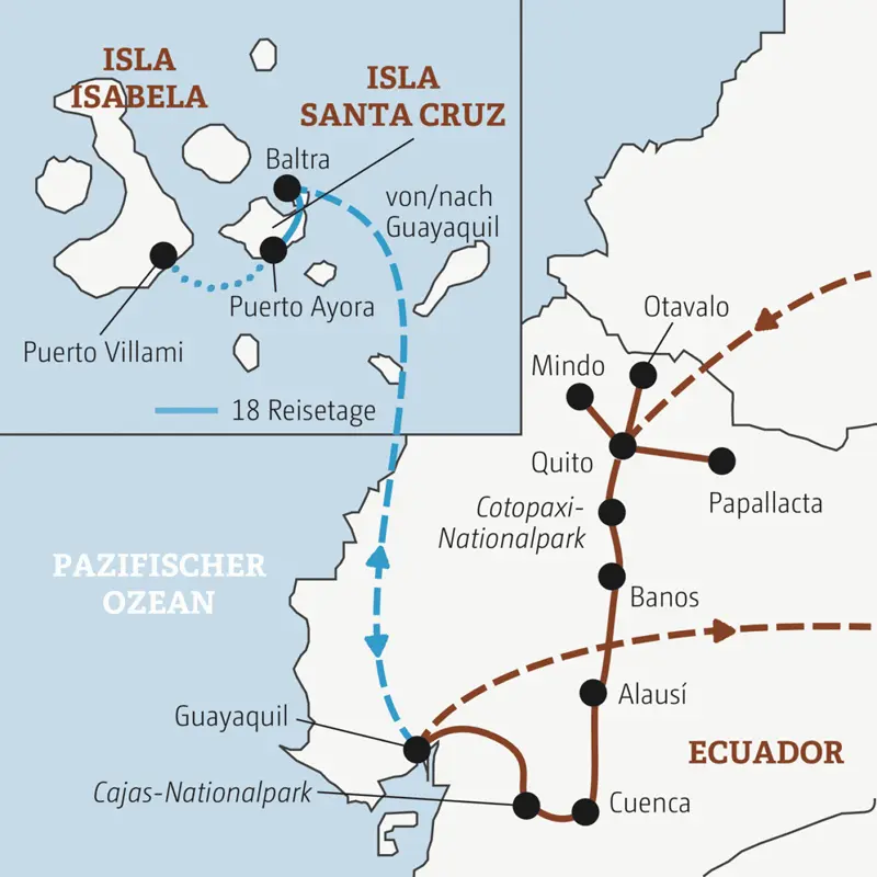 Feuerberge und Wasserwelten, City- und Wildlife, Hoch- und Tiefland ... mit südamerikanischem Temperament umarmt Ecuador Kontraste, Kulturen, Klimazonen. Wir nehmen alle Highlights mit: Nabel-der-Welt-Schau in Quito, Äquator-Hopping, Fahrt auf der Vulkanallee, Kraterpicknick, Märkte und Manufakturen, Flora und Fauna, Naturwanderungen und -wunder. Obendrauf kommt noch unser eigener Soundtrack - was für ein Andenabenteuer!