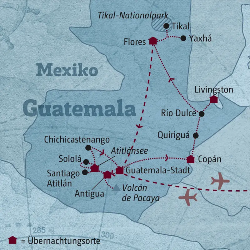 Die Idee dieser Reise: Guatemala, das für viele noch ein weißer Fleck auf der touristischen Landkarte ist, umfassend entdecken. Die Route unserer Länderexpertin führt Sie nicht nur zu den faszinierenden Mayaruinen Yaxhá, Tikal und Copán, sondern auch nach Antigua und zu einem der schönsten Seen des Kontinents: dem Lago Atitlán. ANTIGUAS Häuserfassaden erstrahlen in leuchtendem Blau, Rot oder Weiß. Überall farbenprächtige Blumen. Wenn Sie Souvenirs suchen – keinen Touristenramsch, sondern echte Handarbeit der Mayas – dann ist der Markt von CHICHICASTENANGO ein Muss für Sie! Der früheren Hochkultur der MAYAS begegnen Sie in den alten Ruinenstätten. Am beeindruckendsten finde ich das noch ziemlich unbekannte YAXHÁ. Parkähnlich ist das Gelände zwischen den Stufenpyramiden, der Rest dichter Dschungel. Wagen Sie sich ruhig ein paar Meter hinein: Sie werden begeistert sein von dem Dickicht aus Farnen, Orchideen, Bromelien und Lianen.