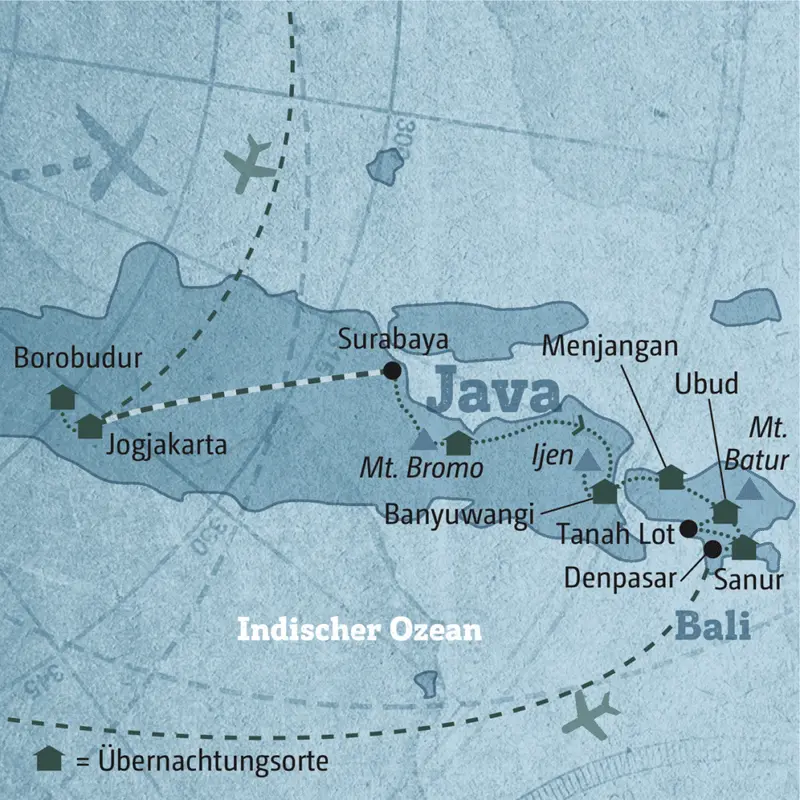 Die Idee dieser Reise: Kombinieren Sie die beiden indonesischen Inseln Java und Bali. Auf der vorgeschlagenen Route unserer Länderexpertin können Sie in rauchende Vulkane blicken, Tempel besichtigen und am Strand relaxen.Einen unvergesslichen Sonnenaufgang erleben Sie über BOROBUDUR, der größten buddhistischen Tempelanlage der Welt. Und die liegt ausgerechnet mitten im Dschungel von Java, der muslimischen Insel. Wundern Sie sich also nicht, wenn der Muezzin hier seine Schäflein per Tonband ans Beten erinnert. Zuerst mit dem Jeep und dann weiter zu Fuß geht's hinauf zum Kraterrand des MT. BROMO. Ein eisiger Wind bläst hier oben, in über 2300 m Höhe. Sobald die Sonne als orangefarbener Ball auftaucht, verzieht sich der Morgennebel und gibt den Blick frei auf die umliegenden Vulkankegel. Klein, aber fein ist der MEERESTEMPEL TANAH LOT. Auf dem Felsen entspringt eine Süßwasserquelle, obwohl er mitten im Meer liegt.