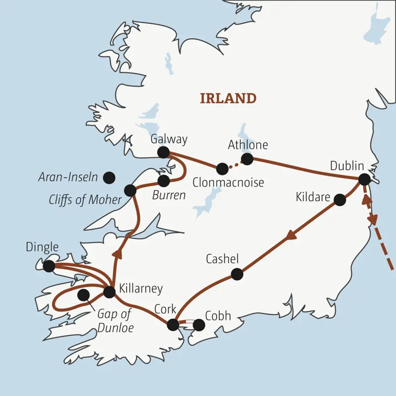 Slán, Amelia, mach's gut, auf ein Wiedersehen in Irland! Im Tagesverlauf Transfer zum Flughafen in Eigenregie und Rückflug. (F)