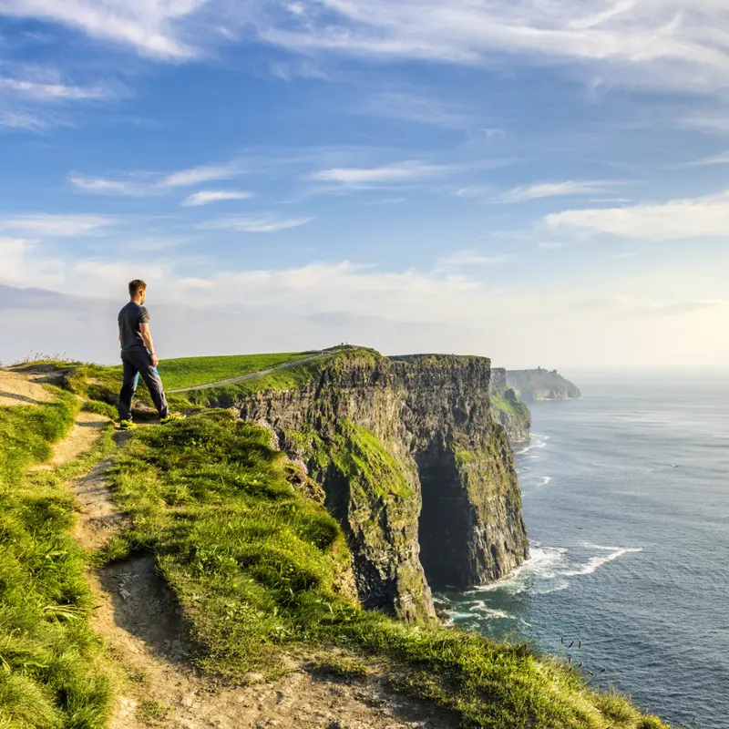 Mit der Fähre über die Shannon-Mündung von Tarbert nach Kilimer. Schwindelfreie vor: Wir stehen auf den Cliffs of Moher - mit 230 m zählen sie zu den höchsten Steilklippen Europas und sind ein absolutes Muss auf unserer Tour. Weiter in die berühmte Kalksteinregion des Burren. Wir wandern tief hinein in die bizarre Felslandschaft mit Quellen, Höhlen und plötzlich verschwindenden Flüssen ... Hören wir da etwa eine Geige? Noch rechtzeitig für einen ersten Bummel durch die musikalische Stadt erreichen wir mit dem Bus Galway. (F)