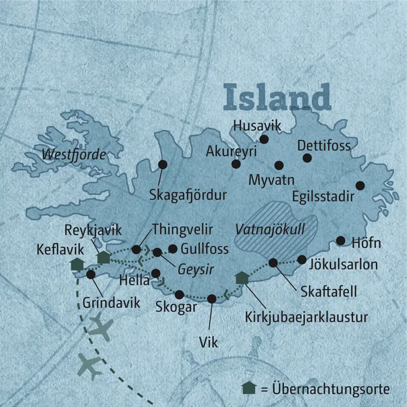 Frühmorgens Fahrt zum Flughafen Keflavik, wo Sie Ihren Mietwagen abgeben. Individueller Heimflug. (F)