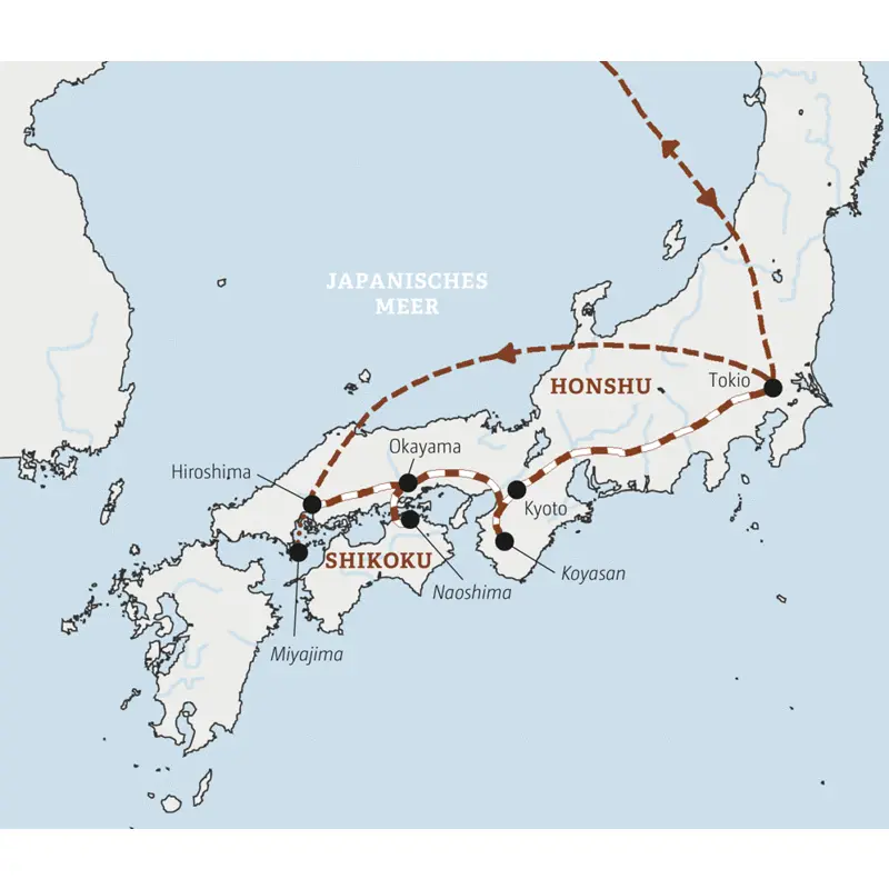 Japan bezahlbar, aber trotzdem persönlich und in kleiner Gruppe? Geht das? Und wie das geht: auf einen Sprung nach Hiroshima, Okayama, Kyoto und Tokio, zu den schönsten Tempeln wie dem Itsukushima-Schrein oder dem Fushimi-Inari-Schrein, auf Inseln, Märkte, heilige Berge. Der Trick: Wir nehmen den Shinkansen, die U-Bahn oder gehen auch mal zu Fuß, meditieren, essen auf Knien, sind einfach mittendrin im Leben.