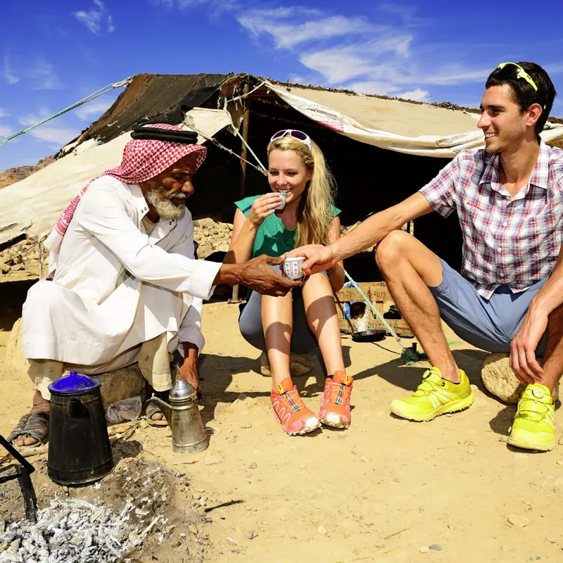 Morgens nach El-Beidha: Der Sik el-Barid war einst wichtiger Karawanenrastplatz und wie das größere Petra eine Nekropole der Nabatäer. Weiter auf der berühmten "Weihrauchstraße": Reich beladen passierten Kamelkarawanen die grandiosen Felsschluchten auf ihrem Weg vom Jemen zum Mittelmeer. Wir erkunden die faszinierende Wüstenlandschaft des Wadi Ram auf einer ca. zweistündigen Fahrt mit Geländefahrzeugen: Ein ockerfarbenes Trockental, aus dem schroffe Berge herausragen. Je nach Licht und Sonnenstand sind die Felsgiganten mal goldgelb, rostbraun, violett oder gar feuerrot. In unserem Wüstencamp prasselt schon das Feuer und es duftet nach frisch Gegrilltem. Fackeln flackern und über uns funkelt der unendliche Sternenhimmel. F/A