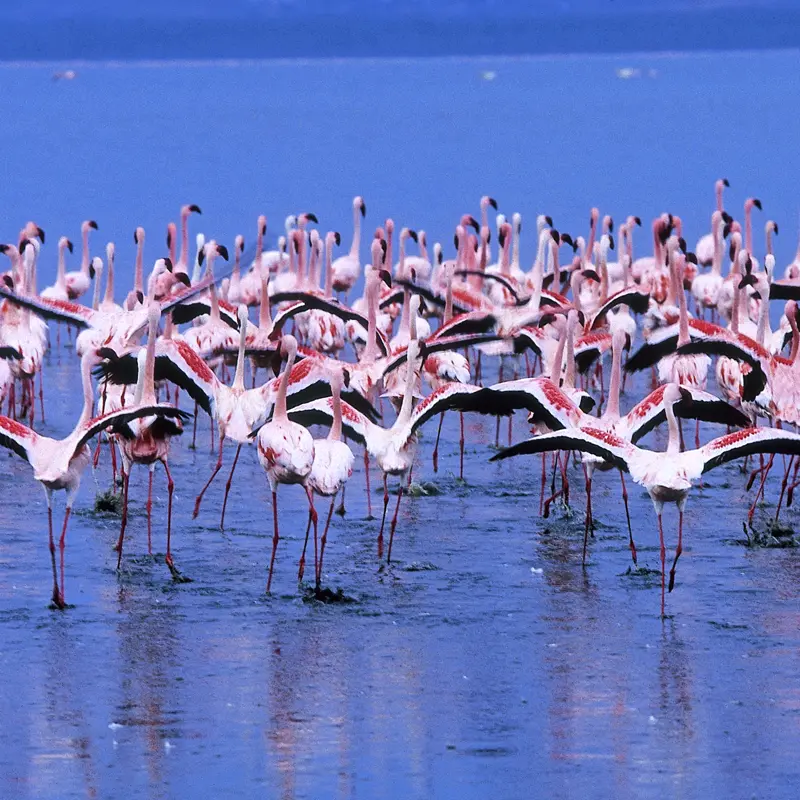 Walking Safari oder Fahrradtour im nahe gelegenen Hells-Gate-Nationalpark. Anschließend Ausflug zum Lake Nakuru. Mitten in der Savanne liegt das feuchte Zuhause zahlloser Flamingos, und im Akaziendickicht trampeln immer mal wieder Weiße und Schwarze Nashörner herum. Nachmittags Rückkehr zu Ihrer Lodge.