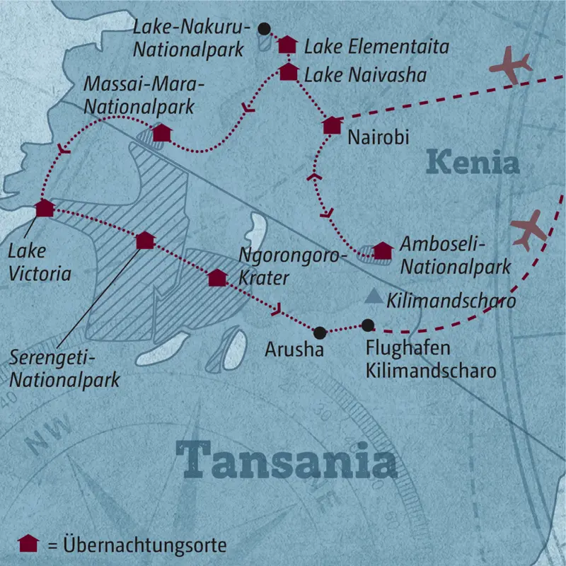 Die Idee dieser Reise: die klassischen Safariländer Tansania und Kenia kombinieren. Der Routenvorschlag unserer Länderexpertin führt Sie u. a. in die Nationalparks Amboseli, Massai Mara, Serengeti und Ngorongoro. Vielleicht sind Sie ja dabei, wenn Millionen Tiere zwischen den Schutzgebieten auf Wanderschaft gehen? Sie parken direkt neben einem Trampelpfad. Hier, am Fuß des KILIMANDSCHARO, ziehen täglich die Elefantenkühe mit ihren Jungen vorbei. Für mich gehört der AMBOSELI-NATIONALPARK zu den besten Plätzen in ganz Afrika, wenn man den grauen Giganten hautnah begegnen möchte. Weiter zum LAKE NAKURU. Bis zu zwei Millionen Flamingos können sich hier tummeln und den See unter rosa Farbtupfern verschwinden lassen. Ihrer Leibspeise – Krebsen und Algen – verdanken sie das herrlich rosafarbene Gefieder.