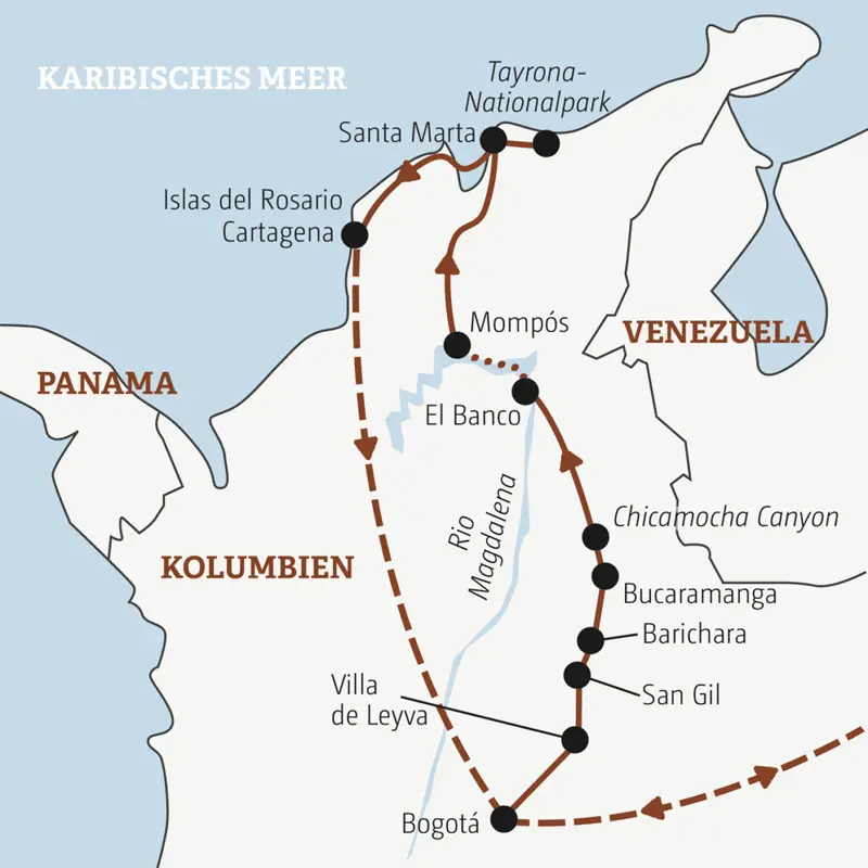 Letzte Etappe: mit dem Bus an der Karibikküste entlang nach Cartagena - die Stadt, die auf keiner Kolumbienreise fehlen darf. Alejandro verschafft uns in der Altstadt Orientierung zwischen historischen Festungsmauern, Palästen und Glaubenshäusern, dann lassen wir uns durch die Gassen des Getsemani-Viertels treiben, begleitet von den schnellen Takten des Champeta, dessen afrikanische Wurzeln unverkennbar sind. (F)