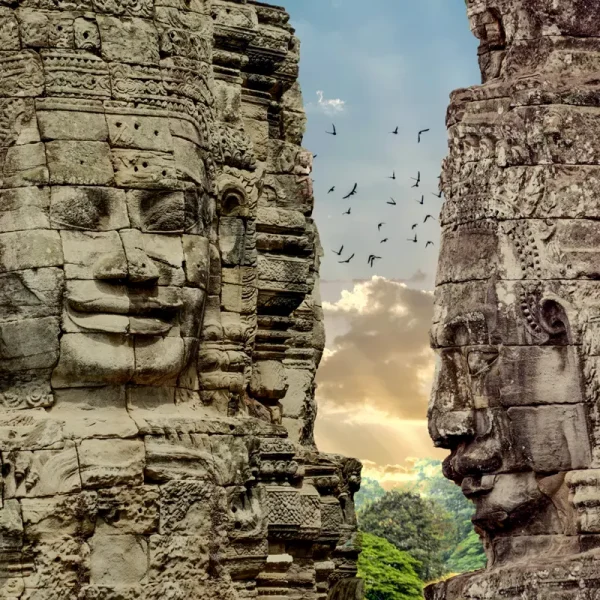 Ausführlicher Besuch des Tempelareals von Angkor. Zunächst nach Angkor Thom, auch als "die große Stadt" bezeichnet. Neugierig lächelnde Gesichter aus Stein blicken vom Bayon-Tempel auf Sie herab. 54 Türme mit jeweils vier Gesichtern bilden diesen weltweit einzigartigen Gebäudekomplex. Alles ist monumental: die 350 m lange Terrasse des Elefantenkönigs, die Terrasse des Leprakönigs mit unzähligen Apsara-Figuren und der riesige Angkor-Wat-Komplex, nicht umsonst als größter Sakralbau der Welt bezeichnet. Auch die Ruinen von Banteay Srei, der Zitadelle der Frauen, und Banteay Samre sind künstlerisch vom Feinsten. In Ta Prohm dagegen grüßt noch das Dschungelbuch: Hier hat sich der Urwald über die Tempel hergemacht und versucht, sie wieder mit üppiger Vegetation und Baumwurzeln zu überwuchern.