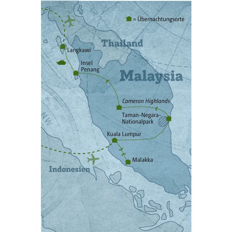 Die Idee dieser Reise: Tauchen Sie in das Großstadtleben von Kuala Lumpur ein und entdecken Sie anschließend, wie facettenreich die malaiische Halbinsel ist. Denn der Routenvorschlag unserer Länderexpertin bringt Sie auch in den tropischen Regenwald des Taman-Negara-Nationalparks, zu den Teeplantagen der Cameron Highlands, ins kolonial-bunte Penang und an die Sandstrände von Langkawi. Haben Sie schon einmal etwas von KUALA SELANGOR gehört? Hier findet jeden Abend ein Lichtspektakel der besonderen Art statt. Einer meiner Lieblingsorte auf dieser Reise ist der TAMAN-NEGARA-NATIONALPARK, hier entdecken Sie den malaiischen Dschungel, in der Nacht hören Sie exotische Geräusche und Sie tauchen in eine andere Welt ein. Auf dem Weg zu Ihrem Badeaufenthalt entdecken Sie, wo in Malaysia Tee angebaut wird, und den Kulturenmix von PENANG. Lassen Sie auf LANGKAWI in Ruhe Ihre Eindrücke Revue passieren!