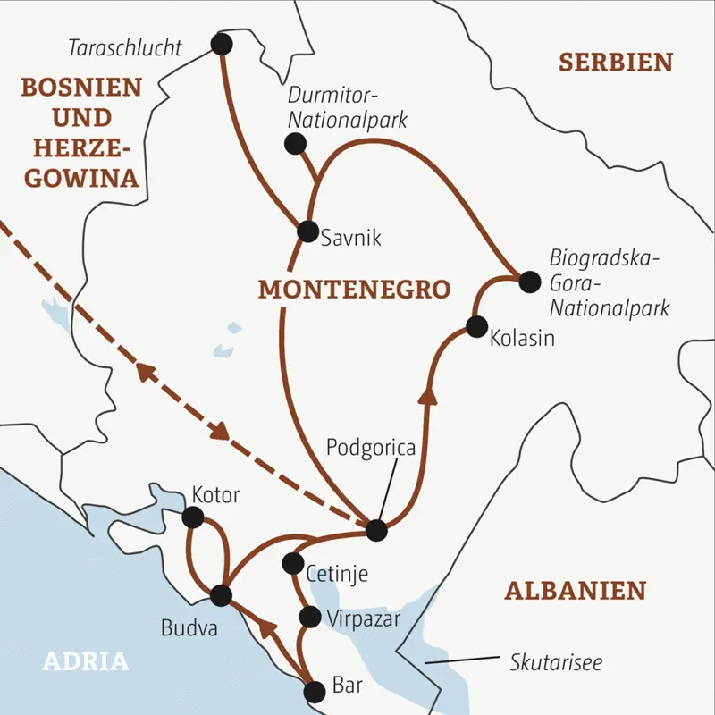 Vormittags bleibt noch Zeit für einen letzten Sprung ins Wasser, dann sind wir auch schon unterwegs zum Flughafen von Podgorica, wo sich Milan von uns verabschiedet. Nachmittags Rückflug Richtung Heimat und Ankunft am Abend. (F)