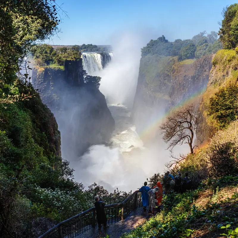 Am Morgen eine letzte Pirschfahrt im offenen Safarifahrzeug. Genießt irgendwo in einem Baum gerade ein Leopard den Blick auf den Chobe ... oder auf die Antilopen? Dann hinüber nach Simbabwe. "Mosi-oa-Tunya" bedeutet Donnerwolke. Entdecker Livingstone benannte das Naturschauspiel nach seiner Königin Victoria Falls. Feucht und fröhlich erleben wir die Königin der Wasserfälle und übernachten ganz in der Nähe. (F)