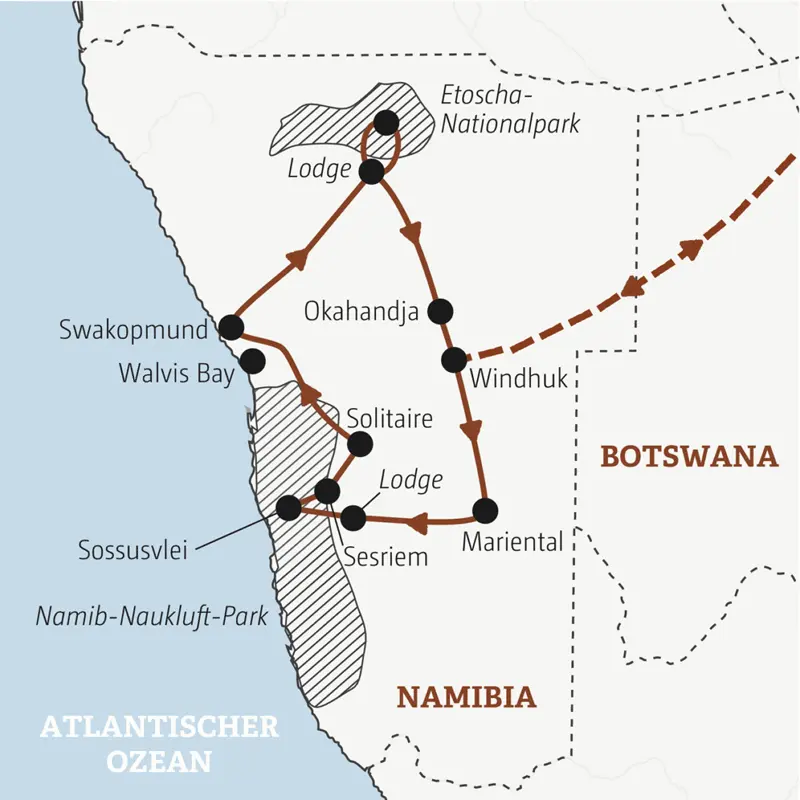 Löwen, Elefanten und Nashörner satt im Etoschapark, versengte Wüstenlandschaften in der Namib, Pelikane und Flamingos am Atlantik – in Namibia erleben wir die ganze Faszination Afrikas! Wir pirschen mit Pfeil und Bogen durch den Busch, folgen Spuren deutscher Kolonialgeschichte in Windhuk und Swakopmund und wandern durch den Sesriem-Canyon und auf rote Dünen. Und in unseren Lodges sind wir immer ganz nah dran an der wilden Natur!