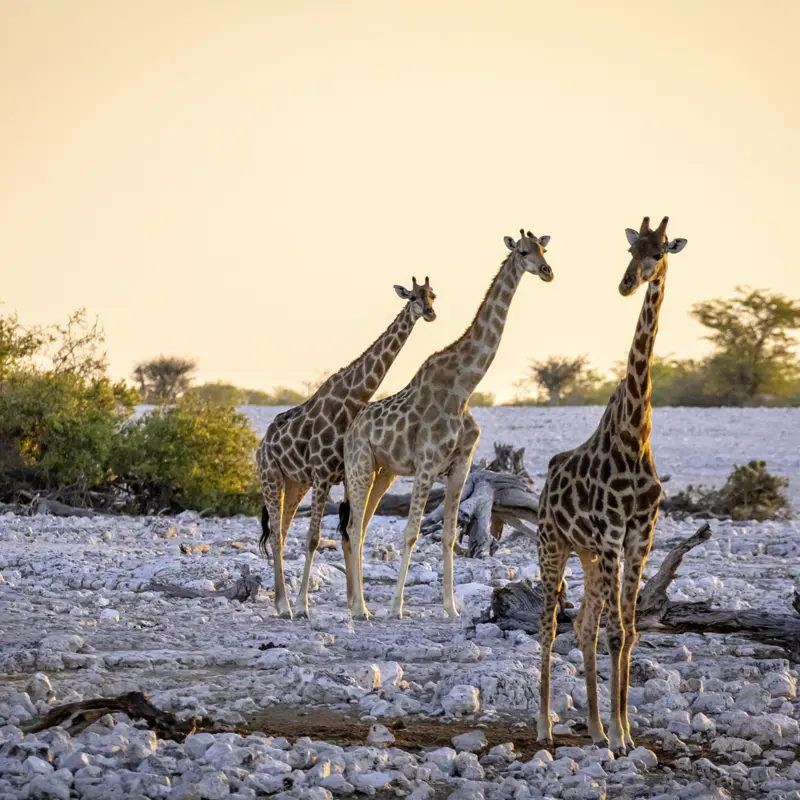 Kameraakkus aufgeladen? Nach dem Frühstück Fahrt zum Etoscha-Nationalpark. Auf einer Pirschfahrt mit unserem Scout im Reisebus halten wir Ausschau nach den wilden Bewohnern: Elefant, Nashorn, Löwe und Leopard sind hier genauso zu Hause wie Gnu, Oryx-Antilope, Giraffe, Zebra und Springbock. In der Trockenzeit ist an jedem Wasserloch Showtime, doch auch die feuchte Jahreszeit hat ihren Reiz: Die Savanne erstrahlt in sattem Grün, und die wassergefüllte Etoschapfanne zieht Scharen von Flamingos an. Wer sich den Safariwind um die Nase wehen lassen möchte, unternimmt am Vormittag stattdessen eine halbtägige Safari in offenen Geländefahrzeugen mit den Englisch sprechenden Rangern der Lodge (gegen Mehrpreis, Ausflugspaket). Nachmittags treffen sich alle wieder und es geht noch einmal für alle mit dem Reisebus durch den Park. F
