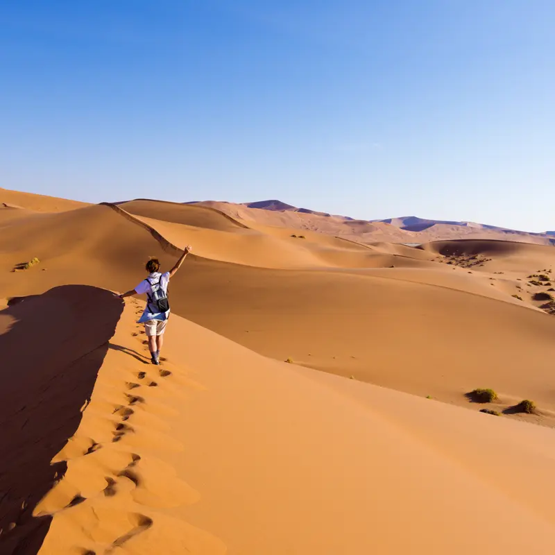 Heute klingelt der Wecker früh – schon vor Sonnenaufgang brechen wir auf in das Herz der Namibwüste, um die höchsten Dünen der Welt zu erleben. Bis zu 320 m hoch türmt sich der ockerfarbene Sand. Die letzten fünf Kilometer bis zum Sossusvlei legen wir in offenen Geländewagen zurück. Dann erklimmen wir den Gipfel einer der Dünen! Auch wenn das Vorwärtskommen im weichen Untergrund kein Zuckerschlecken ist: Das Panorama ist jede Mühe wert. Nach der Mittagspause geht es in den Sesriem-Canyon. Auf einer kurzen Wanderung (1 Std., mittel) entdecken wir die bis zu 30 m tiefe und etwa 900 m lange Schlucht, die der Tsauchab River vor zwei bis vier Millionen Jahren in den Fels gegraben hat. Anschließend Rückfahrt zu unserer Lodge. F