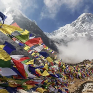 Zu Fuß weiter, vorbei an Gebetsfahnen, ins Dorf Landruk (1565 m, Gehzeit ca. 4 Std., Trekkingdistanz ca. 6 km). Von Ghandruk aus geht es erst einmal bergab, wieder hinunter zum Ufer des Modi. Mit etwas Glück sehen Sie die nepalesischen Honigsammler, wie sie sich mit dem Seil an den Klippen hinablassen, um aus den an den Fels gebauten Waben den Honig einzusammeln. Vom Fluss geht es dann wieder bergauf nach Landruk.