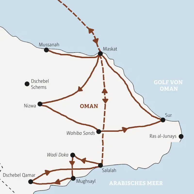Unser Tor nach Arabien: Maskat. Im Sultanat glänzen Prachtbauten und Goldbasare um die Wette, verströmen Weihrauch und Gewürze die Magie des Orients. Bei der Fahrt im Jeep durch den Sand kommt Abenteuer-Feeling auf, beim Sonnenuntergang auf den Dünen ein Gefühl unendlicher Freiheit. Das Weihrauchland Dhofar rahmen endlose Strände und weite Wüsten, in Salalah erwartet uns das tropische Flair des Südens.