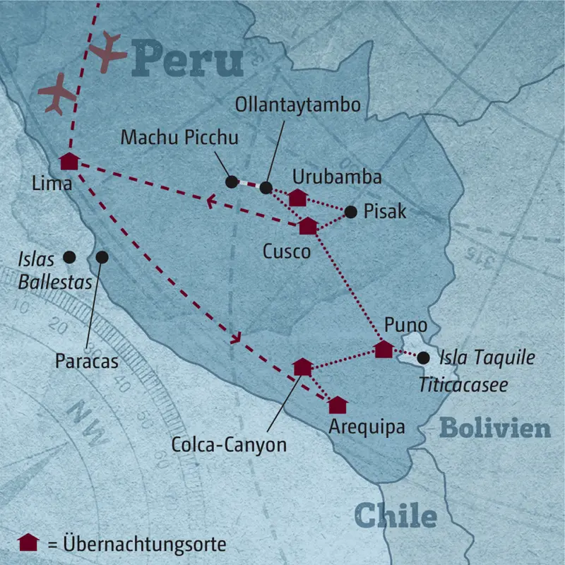 - Wechselnde örtliche, Deutsch sprechende Reiseleitung oder Driver-Guide (Fahrer und ortskundiger Führer in einer Person); während der Busfahrt von Puno nach Cusco Englisch sprechende Reiseleitung
