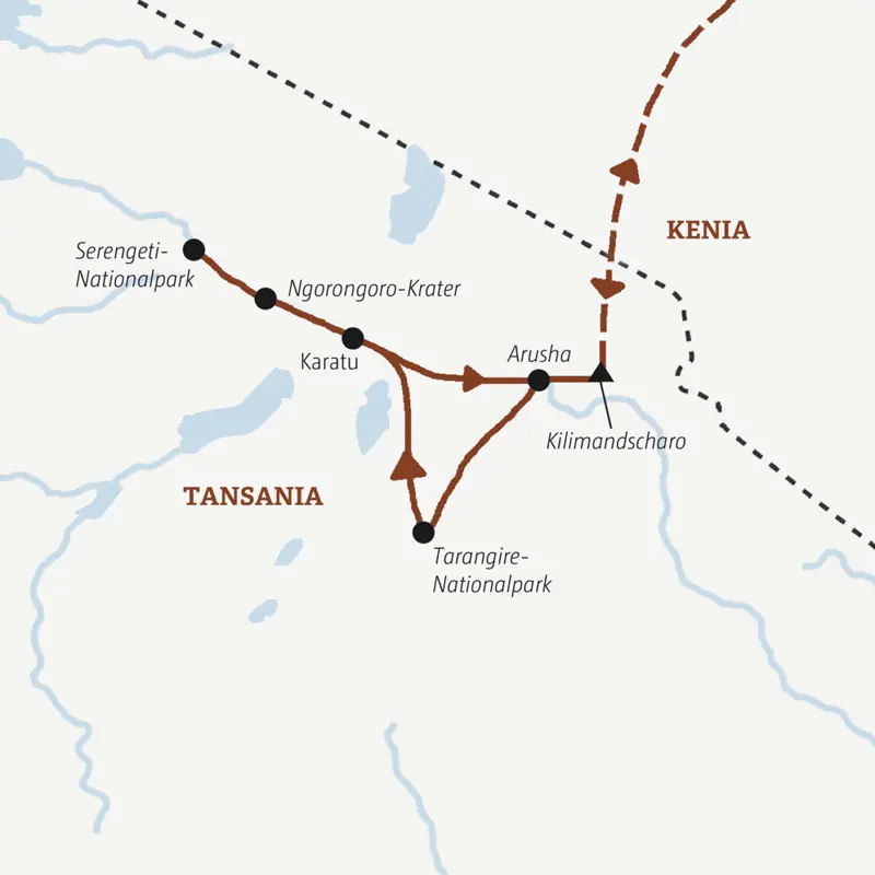 Löwen jagen im Affenzahn eine Gazelle. Elefanten baden trompetend im Fluss. Eine Herde Zebras grast neben unserem Geländewagen. Solche Momente machen diesen Safaritrip in kleiner Gruppe unvergesslich! Wir besuchen die schönsten Nationalparks in Tansania: die Serengeti, den Ngorongoro-Krater und Tarangire. Immer auf den Spuren der Big Five. Dazwischen Nächte im Zeltcamp, Fahrradtour zur Kaffeeplantage, Blicke auf den Kilimandscharo und Zeit zum Relaxen.