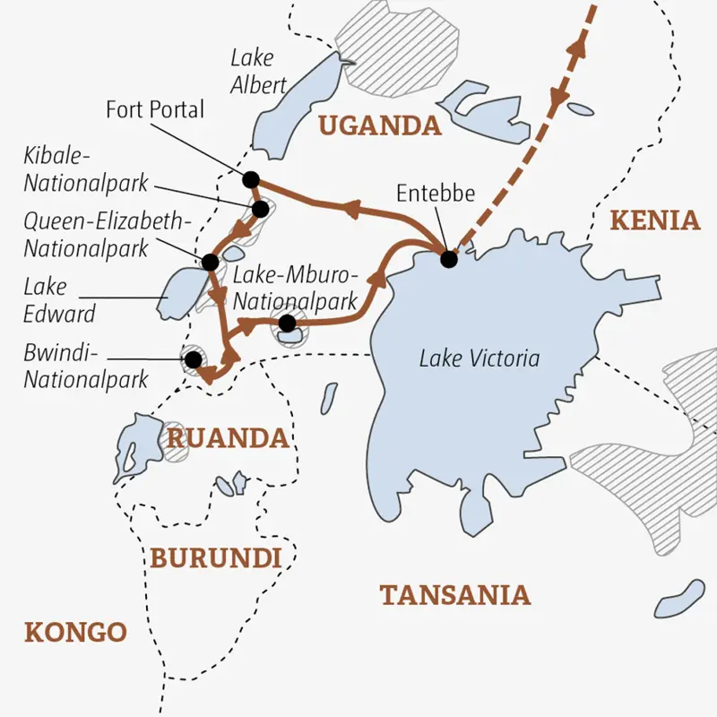 Den Vormittag verbringen wir auf Pirschfahrt im Lake-Mburo-Nationalpark. Der kleine Park ist Heimat von Giraffen, Zebras, Antilopen und Büffeln. Außerdem ist er das einzige Reservat Ugandas, in dem neben Antilopen auch Impalas vorkommen. Wenn wir aufmerksam sind, sehen wir vielleicht einen der schwer zu entdeckenden Leoparden, die sich im Buschwerk versteckt halten. Am Nachmittag bleibt Zeit am Pool der Lodge mit Blick auf ein Wasserloch die Seele baumeln zu lassen. F/M/A