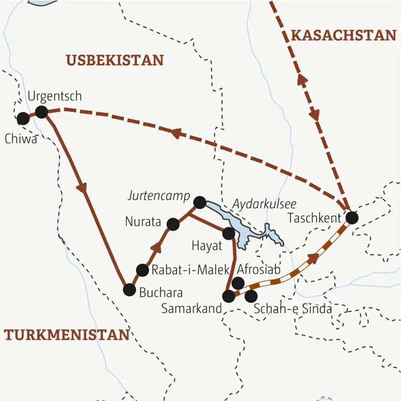 Schon zu Zeiten von Dschingis Khan, Alexander dem Großen und dem Turkmongolen Timur reisten Karawanen auf der Großen Seidenstraße und waren lange unterwegs. Wir haben es bequemer bei der Entdeckung der Oasenstädte Chiwa, Buchara und Samarkand. Mit ihren blauen Kuppeln und den glasierten Kacheln sehen sie noch heute aus wie vor Hunderten von Jahren. In einem Jurtencamp lernen wir die Ruhe und Abgeschiedenheit der Steppe kennen, und in den Bergen um Hayat machen wir Bekanntschaft mit den gastfreundlichen Einwohnern.
