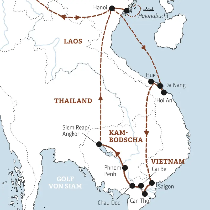 Zwei Länder - viele Gesichter. In Vietnam begegnet uns ein charmanter Mix aus asiatischer Geschäftigkeit, religiöser Vielfalt und wahren Naturschätzen. Und auch im buddhistisch geprägten Kambodscha hält langsam die Moderne Einzug. Eine Rundreise durch das faszinierende Indochina von heute mit seinen schwimmenden Märkten, Karstfelsen und kolonial geprägten Altstädten. Über Nacht auf einer Holzbarke durchs Mekongdelta und über Land von Phnom Penh zu verwunschenen Tempeln. Und als krönender Abschluss: Angkor, die Stadt der Götter!