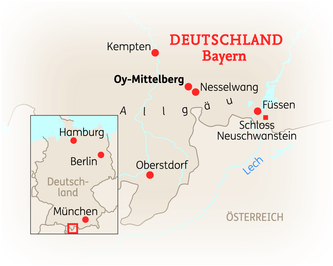 Der idyllische Kneipp- und Luftkurort Oy-Mittelberg gilt mit seinen alten Bauernhäusern und seiner traumhaften Lage mit Blick zur Zugspitze als eines der schönsten Dörfer des Allgäus. OyMittelberg und Umgebung bieten Ihnen viele Freizeitmöglichkeiten. Gegen eine geringe Gebühr bietet das örtliche Tourismusamt regelmäßig geführte Thementouren an (buchbar über das Hotel). Empfehlenswert ist eine Stadtführung durch Kempten oder eine Fahrt nach Nesselwang, Oberstdorf oder Füssen