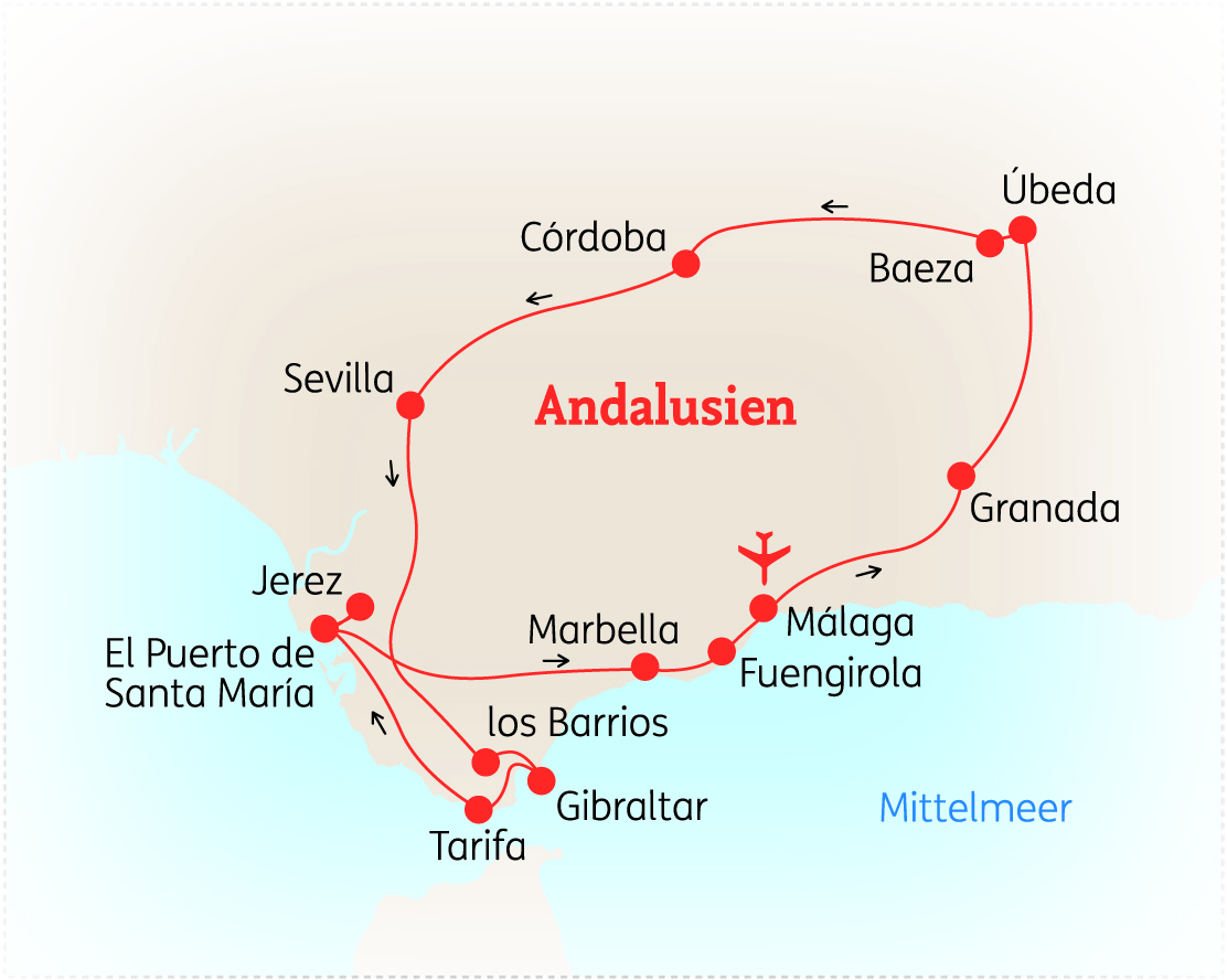 ANDALUSIEN - Erleben Sie bei dieser 14-tägigen Reise die größte und facettenreichste Region Spaniens. Neben den kulturellen Höhepunkten Granada, Córdoba und Sevilla erwarten Sie die glanzvollen Städte Jerez und Marbella sowie der berühmte Affenfelsen in Gibraltar. Lassen Sie sich von der reichhaltigen Kultur beeindrucken und erfahren Sie dabei viel über die bewegte Geschichte, die Festkultur, die andalusische Küche und das Leben der Andalusier im Alltag.