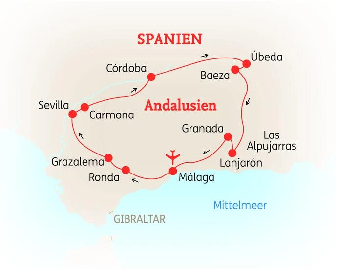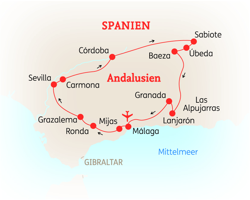 Erleben Sie bei dieser 9-tägigen Reise die kulturellen Höhepunkte Andalusiens: Sevilla, Córdoba, Granada, Baeza und Úbeda sowie die faszinierende Stadt Ronda, malerische „Weiße Dörfer“ und ursprüngliche Orte im Alpujarras-Gebirge. Dabei wohnen Sie in ausgesuchten Landhotels in landschaftlich reizvollen Regionen oder in der Nähe kleiner Städte. Diese Reise bietet Einblicke in die geschichtsträchtige Vergangenheit und lädt nach einem langen Tag zum Erholen in einem schönen Ambiente ein.